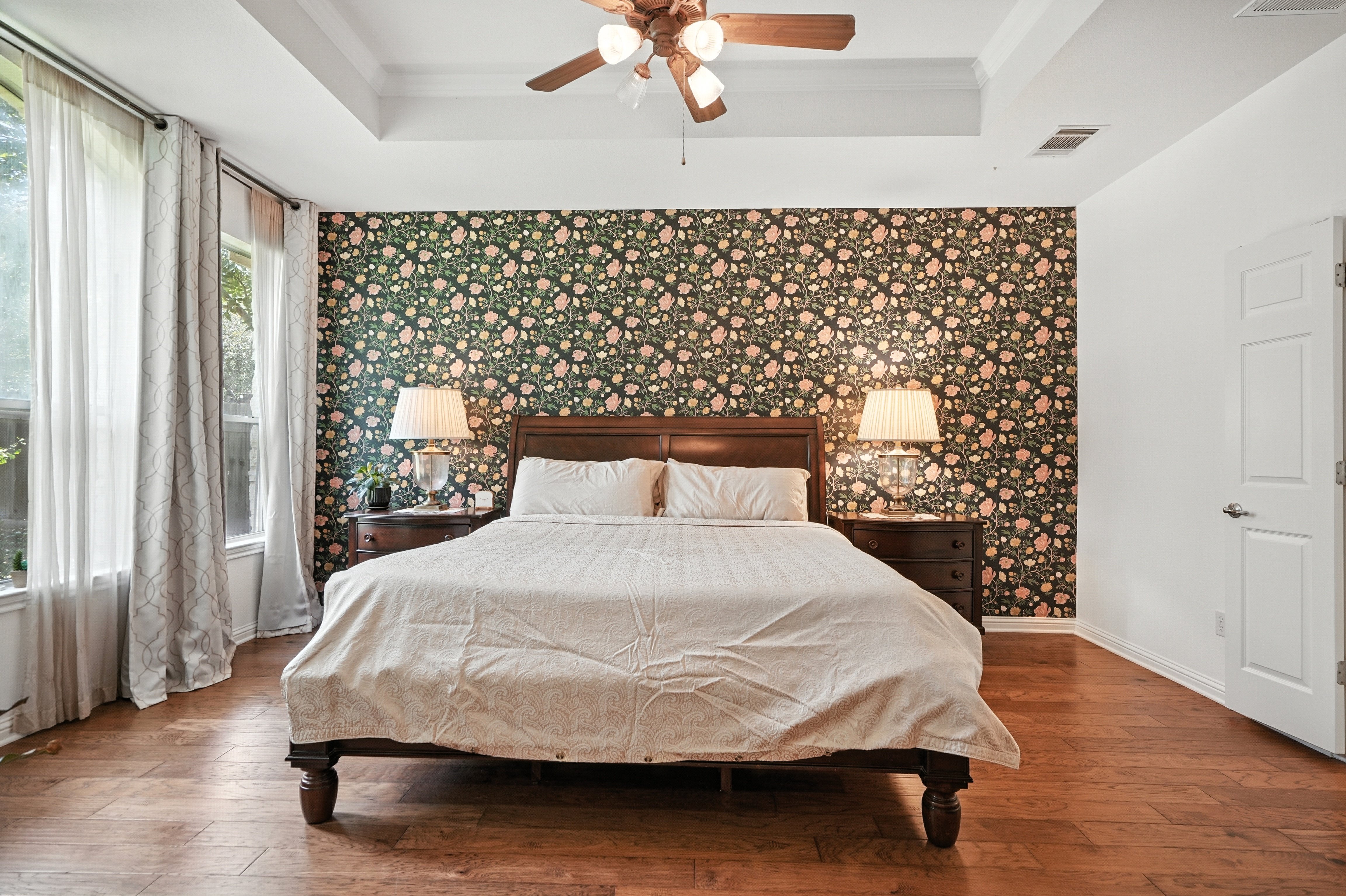 The primary suite offers a private retreat with a tray ceiling, crown molding, and a spa-like ensuite bathroom complete with a double vanity, garden tub, and frameless shower.